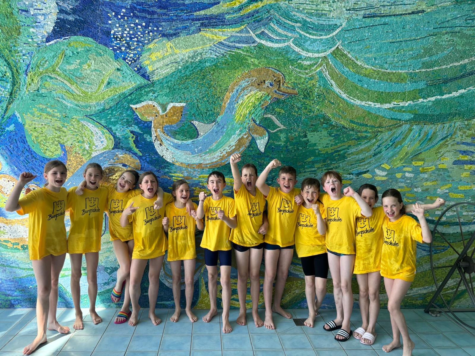 - Platz im Schwimm-Wettkampf – Unsere Wettkampf-Mannschaft: Anna, Niklas, Oscar, Noah, Aika, XX, Lena, Laura, Emma, Ida, Kilian und Alina – mit den Lehrkräften Frau Vitrey und Herr Krebs